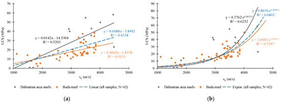Uniaxial compressive strength (UCS) and ultrasonic pulse wave velocity (vp) showed significant correlation in both cases. The coefficient of determination for linear regression is almost the same for both—R2 = 0.52 for the Dalmatian area marl and R2 = 0.51 for the Buda marl (Figure 10a), but the slopes of the lines are very different. The presence of a few outliers is noted on the scatter plots in Figure 10.