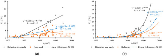 Static Young‘s modulus (Es) and ultrasonic pulse wave velocity (vp) show very high correlation in the case of the Dalmatian marls, with R2 = 0.84 (Figure 11a). However, for the Buda marl, the linear regression did not provide a good relationship between the two parameters (R2 = 0.32). Therefore, the data were also analyzed by non-linear regression. An exponential equation was used to describe the correlation between the ultrasonic pulse wave velocity and static Young‘s modulus for the Buda marl, and the R2 value of 0.68 was obtained, which is considerably higher than the previous result for the linear correlation. For marls from the area of Dalmatia, non-linear regression does not give a better correlation than linear regression, but for all analyzed samples from the both data sets using the exponential relationship, the R2 value of 0.68 is obtained, the same as for Buda marl (Figure 11b).