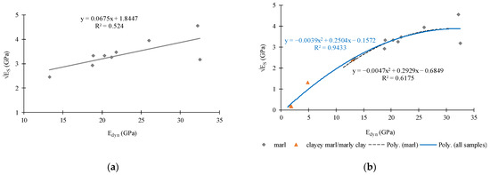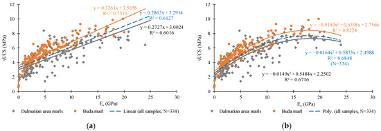 The shape of the scatter also indicates the possibility of non-linear parabolic correlation, with R2 = 0.67 for the Dalmatian area marls and R2 = 0.82 for the Buda marl (Figure 12b). The data on the scatter plot are quite dissipated and the given equation does not fit the data well enough, and therefore, it should be considered with caution. However, the value of the coefficient of determination and the fact that the higher values of strength imply higher values of modulus, confirm the validity of the presumption that these variables are truly correlated. This relation shows symmetry between the Dalmatian area marls and the Buda marls. The two scatter plots and the shape of the correlation lines are similar. The difference is that the marls from the Dalmatian region have more UCS results with lower strength; therefore, the correlation curve is below the one related to the Buda marls.