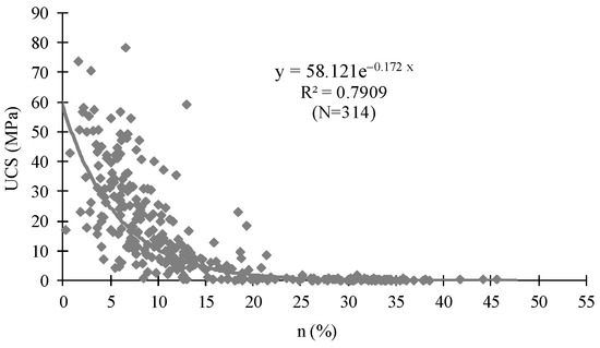 Kanji and Galvan [4] collected and analyzed data from more than 200 publications concerning soft rock behavior. Based on that data, they considered relationships between porosity and absorption, porosity and density, porosity and UCS, density and UCS, and “modulus of deformability” and UCS. The obtained relationships showed that absorption, porosity, and density were very well correlated. The correlation between the UCS and porosity shows that the lower the porosity, the higher the strength of the material, which allows predictions of the UCS value based on the porosity. The modulus of deformability and UCS relationship shows that higher material strength indicates higher values of modulus.