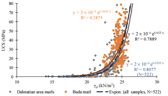 The uniaxial compressive strength (UCS) and dry unit weight (γd) relationship, as well as that for UCS and porosity (n), show non-linear behavior. Therefore, these relationships are described using simple non-linear regression as an exponential function. For the Buda marl only, the uniaxial compressive strength and dry unit weight relationship were analyzed.