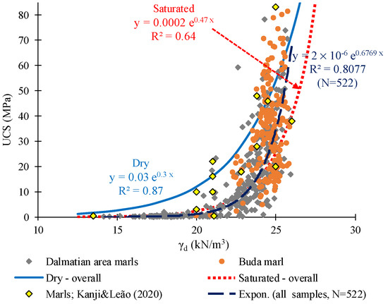 Uniaxial compressive strength and dry unit weight relationship of marls—a comparison of the results obtained here for the both data sets (marls from the area of Dalmatia and the Buda marl) and the “overall” soft rocks results of the study by Kanji and Leão [31].