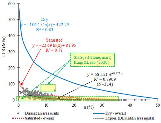 Uniaxial compressive strength and porosity relationship of marls—a comparison of the results obtained here for marls from the area of Dalmatia and the “overall” soft rocks results of the study by Kanji and Leão [31].