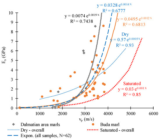 The results of the Es-vp relationship between the Dalmatian area marls and Buda marls do not fit well with the overall soft rocks results of Kanji and Leão [31] for dry samples (Figure 18), but the amount of comparable results is small (marls were not included in the latter study). However, the form of non-linear regression for saturated samples in Figure 18 corresponds to the relationship obtained for the combined results of marls from the regions of Dalmatia and Budapest (all samples, N = 62). The shift of the curve to the left is due to the fact that the latter results were obtained on samples with natural water content.