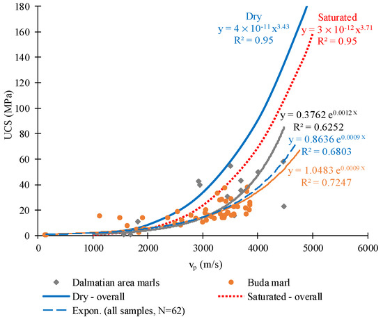 The overall soft rocks results obtained by Kanji and Leão [31] for the UCS-vp relationship of dry and saturated samples are close to the results of the Dalmatian area marls and Buda marls, but the results are not entirely comparable. The study by Kanji and Leão did not include marls and there are very few results for soft rocks that could be compared to marls (e.g., siltstone, shale, and claystone).