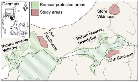 Data were collected from 10 March to 18 April 2019 within three areas in northern Jutland, Denmark (Figure 1): Klim Fjordholme (57°04′40.8″ N 9°07′11.9″ E), Nibe Bredning (57°00′50.4″ N 9°43′39.7″ E) and Store Vildmose (57°14′22.3″ N 9°44′30.1″ E). During this period, the two focus species of the study, pink-footed goose (Anser brachyrhynchus) and barnacle goose (Branta leucopsis), still frequented the area on a regular basis before migrating north [] and the weather allowed for longer consecutive dry field periods. The collecting areas were all important and regularly used as foraging areas for the spring staging geese and were located adjacent to wetland areas protected by the Ramsar convention, Vejlerne, Ulvedybet and Nibe Bredning [,,]. Ten specific fields from these candidate areas, varying from 2.8–15.2 hectares (in total 58 ha), were chosen, which had the characteristics of cultivated grassland or pastures, allowing for the collection of data.