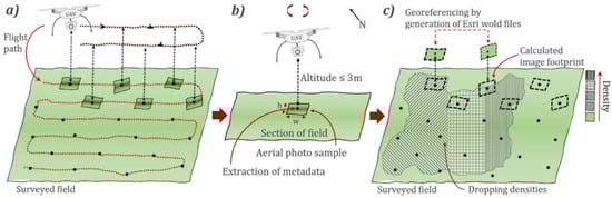 Flowchart reflecting the protocol for the georeferencing workflow for single aerial photo sampling (step-by-step details in Supplementary Material S2). (a) Unmanned aerial vehicle (UAV) surveys of the targeted fields were conducted, thereby yielding individual aerial photo samples with embedded metadata. (b) The metadata were extracted and used to calculate the image footprint on the field and orientation against north. (c) From spatial transformations derived from the metadata, an Esri world file was generated for each photo sample, and subsequent automated recognition and georeferencing in GIS software were obtained. Detection and counting of droppings on the aerial photos were performed in GIS software, which enabled fine-scale spatial annotations.