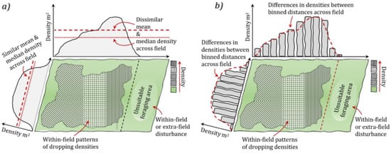 The detection of varying distribution patterns in dropping densities on the surveyed fields in relation to the presence of external landscape elements (Figure 6) indicated that the use of UAV surveys is a useful tool to analyse and assess the behaviour of foraging geese by the indirect method of dropping counts. The highly contagious, skewed and asymmetrical dispersion patterns detected in almost all fields indicated that the behaviour of the foraging geese was likely influenced by external factors, which is in accordance with previous studies investigating dropping densities [,]. These factors could be stress-related effects from the surrounding landscape elements or human activities, such as possible hunting or recreational activities, which potentially can reduce the field utilisation by the geese [,,]. Additionally, foraging preferences and unevenly scattered food sources on the investigated fields, perhaps resulting from some fields being partially water covered during periods of heavy precipitation earlier this spring, might also have played an important role in the fine-scale and within-field habitat selection of the geese [].