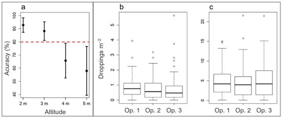 Accuracy in the detection of droppings of 93% and 88% compared to the manual control count from the ground could be seen when flying in altitudes ranging from 2 to 3 m above the field, respectively (Figure 4a). With further increased altitude, the accuracy dropped to 66% at 4 m and 58% at 5 m. A Tukey post-hoc test, computed based on an ANOVA, showed non-significant differences between altitudes of 2 and 3 m when compared to the ground count, whereas the altitudes of 4 and 5 m significantly differed (Figure S4 and Table S3). The flying altitudes of both 2 m and 3 m yielded 95% CI above 80%, thus qualifying both altitudes to be considered valid for the calculations of dropping densities in this study.