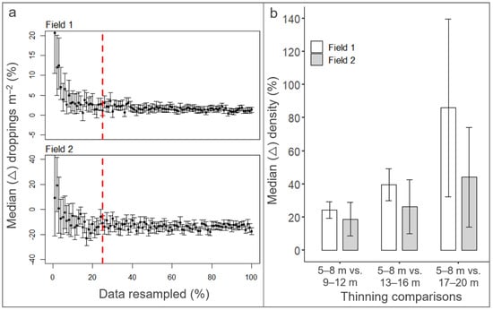 Results for approaches 1 (a) and 2 (b) to determine an optimal sampling frequency. For approach 1 (determination of median density of the whole field), the results, as median differences (∆), are shown for the bootstrapped resampling of the median density per m2 for test fields 1 and 2. Vertical lines represent 95% bias-corrected and accelerated (BCa) confidence intervals (CIs), and the red dashed vertical line indicates 25% resampling of the data. The resampling percentage resulted in high reliability for the calculated median dropping density. For approach 2 (determination of density patterns across the field), the relative difference in dropping density per m2 for test fields 1 and 2 were tested at intervals of 5 m from 0–80 m to the nearest fix point (water ditch). Each of the 16 thinning samples (5–20 m spacings of aerial photos) was then compared with each other, and the median difference was calculated. In order to allow for a more stable comparison, the thinning samples were grouped four at a time (5–8, 9–12, 13–16 and 17–20 m). The grouped interval of 5–8 m was used as the base with which the other grouped intervals were compared. Vertical lines represent 95% CI. The total number of registered droppings was 1316 for test field 1 and 41,191 for test field 2 at 5 m spacing of photos. The area of the tested fields was 2.7 and 8.1 hectares for test fields 1 and 2, respectively.