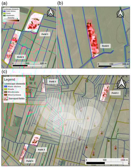 The interpolated heatmaps further illustrated differences in density gradients with respect to both types of and distance to different landscape elements (Figure 6 and Figure 7). On the heatmaps, fields surrounded by windbreaks and roads showed a pronounced clustering away from these elements and often towards the middle of the field. In contrast to this, fields only surrounded by water ditches and no other elements nearby showed the least contagious distribution patterns (Figure 6b). This supports our assumption that water ditches can be considered the least disturbing landscape element (authors’ observations and notes). Consequently, in our study, water ditches were primarily used as a reference to check the robustness of the estimation of avoidance distances to the other landscape elements. The finding of minor decreases in density close to water ditches could be an effect of narrow buffer stripes of less nutrient-rich grass, reducing the value and attractiveness for foraging and thus should not be considered as a direct avoidance effect [].