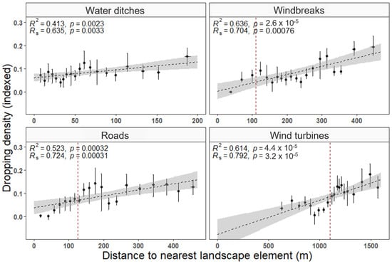 Alterations in dropping densities compared with distances to the four different landscape elements, windbreaks, roads, water ditches and wind turbines. The densities are shown for all aerial photos from all 10 fields, which were compared by creating a relative density index, where one is the aerial photo with the highest density per m2 in a particular field, and zero is the aerial photo with the lowest density. Median densities are calculated based on 5% percentile distance intervals in the dataset. Vertical and horizontal lines represent 95% bias-corrected and accelerated (BCa) bootstrapped confidence intervals (CI). For each landscape element, linear regression is depicted (dotted line), adhering to standard error (SE) for R2 and p-values for the regression slope. Spearman’s rank sum correlation values are depicted (Rs). Consistently decreased densities at lowered distances are denoted for three of the four landscape elements (dashed red vertical lines). Tests were performed and denoted for each landscape element (Rs). The total number of aerial photos for all fields was 2523, and the number of individual droppings was 35,385 in total.