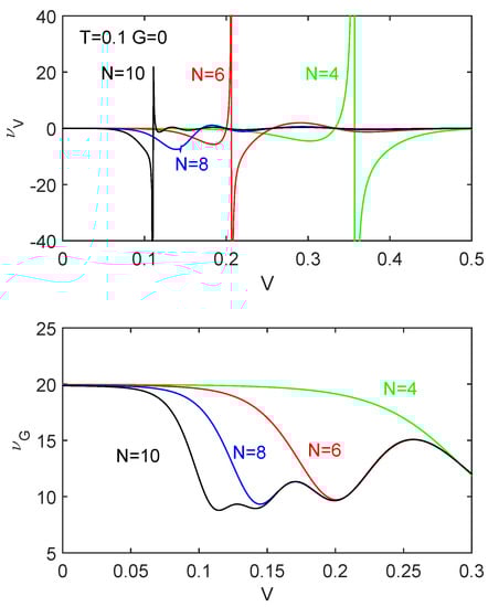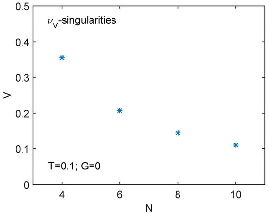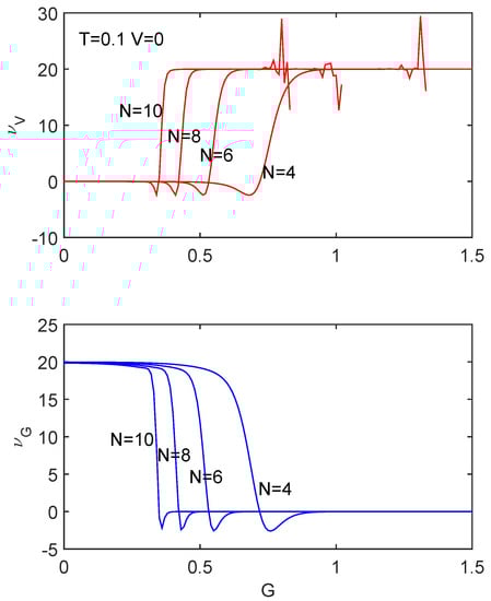 Figure 1 depicts the order–disorder indicators (upper figure) and (lower figure) versus V at and for different N values. In the first case, there is no energy cost, except at the special critical values , where remnants of the spin–flip phase transitions are evident. We can call these remnants singularities. The moral here is that V critical values are detected by . In the second instance (lower figure), we see clearly how these critical V values affect as well. How is this? This is by considerably lowering the associated energy cost of changing G. Thus, we encounter a perhaps unexpected subtle interplay between V and G in the behavior of the energy cost. Finite temperature force V and G interact among themselves.
