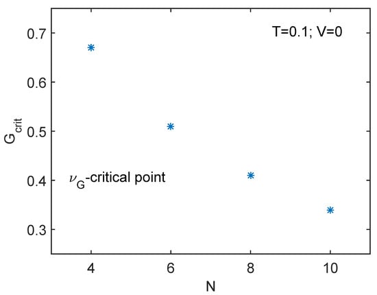 Finally, in Figure 3 and Figure 4, we depict (versus N) the N-dependent critical values of the coupling constants, respectively, and . As is well known [1,3], for fixed N, the system displays a spin–flip phase transition at and a superconducting one at . Naturally, we speak of “critical values” for the coupling constants. At such values, as we saw above, our statistical quantifiers and display “singularities”. Thus, we may say that Figure 3 and Figure 4 display the -singularities or critical points versus N, as we state in the captions. The values of these critical points diminish as N grows.