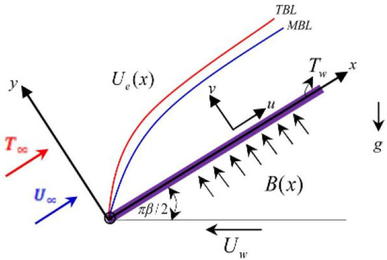 For shows the moving in same direction and show the moving wedge is in opposite directions to the free stream. Moreover, represents the stationary wedge. Similarly, shows favorable pressure gradients to the wedge and show negative pressure gradients. The physical structure in coordinate system is given in Figure 1.