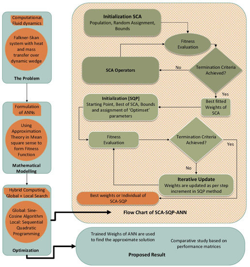 To assess the FS-HTM model’s dynamic behavior, the system is altered to become an optimization problem. Where a fitness function based on MSE is established. The definition of the fitness function is given in Equation (17). The solution to the FS-HTM problem is evaluated based on fitness values. For the optimization of the fitness function, a novel hybrid optimization procedure is introduced. The hybrid technique is based on local search and global search optimization procedures. For global search, sine–cosine algorithm (SCA) is used. The SCA investigates the space of potential optimal values and these values are assigned as an initial point to local search technique sequential quadratic programming (SQP). The SCA was initially presented by Mir Jalili. The SCA is a population-based method motivated by trigonometric functions sine and cosine. It generates a collection of arbitrary solutions and compares them to obtain the best one. For the performance evaluation of SCA, about nineteen composite functions were solved and the results were compared with the results of the genetic algorithm, particle swarm optimization, bat algorithm, flower pollination algorithm, firefly algorithm, and gravitational search algorithm [48]. The results were comparatively better. The reliability and consistency of SCA is tested on many problems, such as designing bend photonic crystals [49], the construction duration and schedule robustness was solved by [50], hydro-thermal-wind scheduling [51], automatic regulation voltage system set up [52], wind plant energy production [53], etc. To improve the exploitation of SCA, it is hybridized with the rapid convergence local search technique SQP and feed-forward neural network. It has many applications in solving problems, such as time-domain radiant transfer, which determines how optical parameters are distributed [54], control allocation with singularity avoidance [55], power system optimal power flow solutions [56], elitist feature selection with a new update mechanism [57], models of nonlinear electric circuits using computational intelligence [58], etc. The designed technique is abbreviated as SCA-SQP-ANN. For validity, reliability, and consistency, the solution of Runge–Kutta order 4 (RK4) is used as a benchmark solution. Figure 2 presents the flow chart for the optimization process.