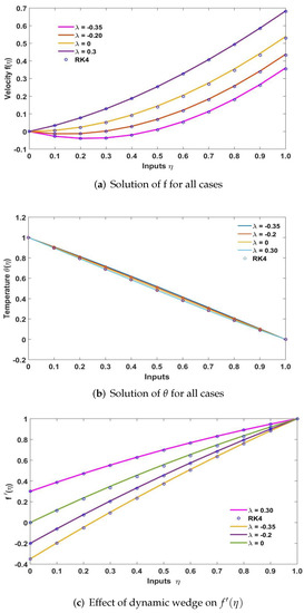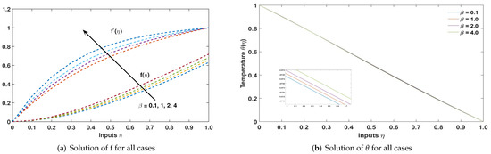 This problem is based on the variation in the velocity ratio parameter (). The values of parameters are , , , and . The variation in values of creates four cases in this problem. For , the wedge is moving in the same direction, and when , the moving wedge is in opposite directions to the free stream; represents a stationary wedge. The problem is solved by SCA-SQP-ANN. The obtained solution by the SCA-SQP-ANN algorithm is drawn against the reference solution of Runge–Kutta order four. The cross referencing of solutions of the suggested technique with reference solution validates the solution. The graphs of all four cases are plotted in Figure 3. Furthermore, the execution of the SCA-SQP-ANN algorithm is assessed using statistical terminology mean, standard deviation (STD), and minimum (MIN).