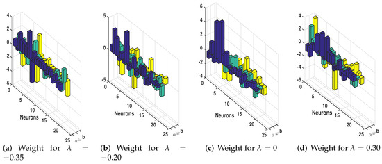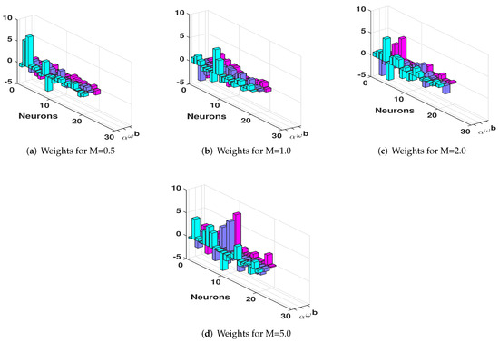The overlapping of solution of the RK4 and SCA-SQP-ANN algorithm validates the obtained solution of SCA-SQP-ANN. The solution of the SCA-SQP-ANN algorithm is based on the trained variable of ANN called weights. The values of weights are drawn using 3D bar graph given in Figure 6. The weights are trained in the interval . These are ten sets of triplet named as . Each color represent , , and , respectively. By substituting these weights in Equation (15) gives the solution to the problem. The expended form of solution is provided in Appendix A with a 14-digit precision.