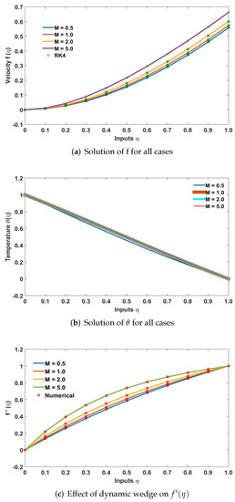 The nonlinear pressure gradient , the Prandtl number Pr, the magnetic parameter, also known as the Hartman number M, the Brinkman number is defined as , where is the Eckert number, and the velocity ratio parameter is the non-dimensional constant in Equations (6)–(8). The definitions of these parameters are given below:
