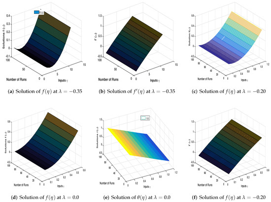 For the evaluation of the performance of the SCA-SQP-ANN algorithm, many techniques are adopted, such as numerical comparison of solutions, evaluation by performance operators, and graphical evaluations. The solutions are validated by comparing graphically and numerically. The reference solutions and proposed numerical solutions are compared numerically in Table 1 and Table 2. For the collection of large data sets, the proposed procedure was executed 100 times, as fewer executions cannot verify the consistency of any algorithm. All 100 solutions were drawn using a Mesh graph to verify the consistency of SCA-SQP-ANN, given in Figure 8a–f. From the figures, it can observe that there are no jumps and worst solutions. All the solutions are smoothly drawn. So that, the suggested algorithm i.e., SCA-SQP-ANN is consistent.