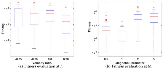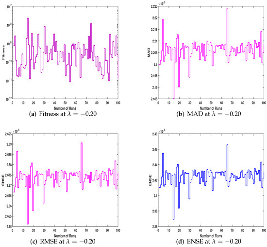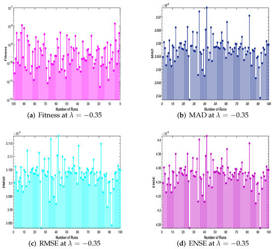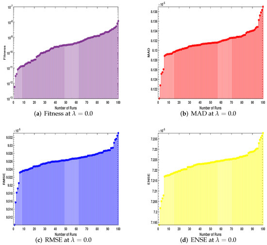 The data collected by multiple runs were evaluated by performance matrices MAD, RMSE, and ENSE as defined in Section 3.3. All the data are plotted in Figure 9a–d, Figure 10a–d, and Figure 11a–d, along with fitness. In Figure 9a–d, a stem graph is used for unsorted data of fitness and performance operators; the data in Figure 10a–d are plotted with a stairs plot; in Figure 11, the data are sorted and plotted with a stem plot. In each figure, the values are about for MAD, RMSE, and ENSE. The fitness values are between – for each case of velocity and magnetic parameter.