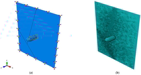 Reference numerical model: (a) assembly and boundaries with (b) random mesh pattern for a typical SPH–FE bird-strike configuration (ABAQUS/Explicit).