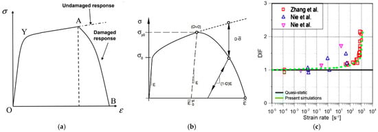 Mechanical characterization of glass material: (a,b) qualitative features of the conventional constitutive model herein adapted to account for glass damage (ABAQUS/Explicit); (c) reference DIF for glass in tension in present simulations.