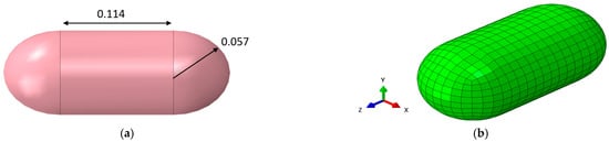 A cylindrical volume, with hemispherical ends like in Figure 6, was taken into account. The cylinder size was derived as a scaled shaped from Figure 6a, where the reported dimensions are representative of a conventional 1.81 kg bird [2]. So far, it is recognized that specific and more refined three-dimensional (3D) shapes should be considered for modeling bird collisions [55,56,57], due to local effects from shape of head, neck and torso of bird bodies during contact after impact. On the other side, the simplified cylinder shape—and its limits—is accepted as conventional volume shape in numerical simulations [9].