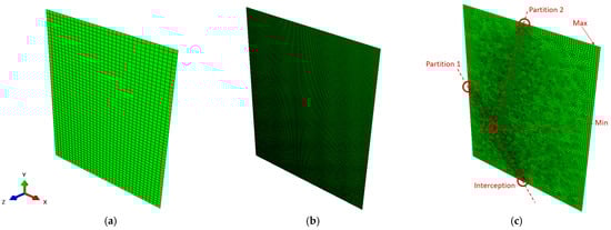 Overall, the mesh sensitivity analysis first included some structured mesh schemes based on regular, 4-node S4R shell elements, and an edge size comprised between a maximum of 30 mm and a minimum of 1 mm for the uniform discretization of the target panel. The examples in Figure 7a,b refer to the 30 mm edge–size model (corresponding to ≈10,500 elements and ≈54,000 DOFs) and the 5 mm edge–size model (≈64,000 elements and ≈376,000 DOFs), respectively. The minimum edge size required to offer stable numerical outputs was detected on the base of a comparative analysis of the results in the elastic and damaged scenarios. After this first step, various random mesh schemes were also addressed. Figure 7c schematizes the typical approach in use. The minimum edge size in the central part of glass panel (“Min”) was selected from a sensitivity analysis for regular 4-node mesh schemes. A maximum edge size (“Max”) was assigned along the perimeter of glass panel, based also on aspect-ratio considerations. To create variable mesh schemes and facilitate a non-symmetrical transition in the “Min–Max” range, two internal partitions were also defined, as schematized in Figure 7c. Basic parametric studies included changes in the interception points/inclination of these partitions, and the verification—for collapse configurations—of mesh-independent cracks randomly distributed and not aligned with initial partitions.