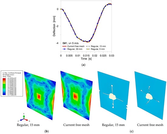Comparative examples can be seen in Figure 8, where the “Current free mesh” model corresponds to Figure 4b assumptions (≈19,500 elements and ≈110,000 DOFs). More in detail, Figure 8a presents the out-of-plane displacement (Z-direction) in control point P1, under B#1 strike, with an imposed impact speed of v = 5 m/s. Such a configuration, for the examined glass panels, corresponds to linear elastic behavior. In Figure 8b, selected contour plots are proposed in terms of maximum principal stress distribution in glass. Finally, Figure 8c shows typical crack propagations—under identical bird-strike—with evidence of “structured” cracks or a random pattern.