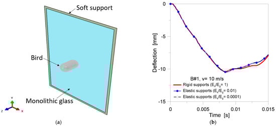 For a given monolithic glass panel under B#1 impactor, with v = 10 m/s, the typical deflection history in the center of the panel is reported in Figure 9b. It can be noted that, under the effect of a localized bird collision, soft supports similar to present assumptions do not mitigate the glass panel from maximum impact effects in the target region, as also confirmed by the trend of monitored displacements. In other words, the use of simplified, ideally rigid linear supports for the present simulations does not significantly affect the dynamic response of examined systems.