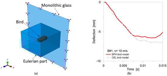 Regarding the SPH bird model, preliminary attention was finally given to the assessment of such a modeling approach and its accuracy compared to the Coupled Eulerian–Lagrangian (CEL) modeling strategy, under the examined impact configurations (i.e., bird mass, M, and collision speed, v). To this aim, the modeling procedure and input calibration of the CEL bird components were carried out as performed in Reference [52]. Figure 10a shows an example of the assembled CEL model for the present assessment, with evidence of a monolithic shell glass panel and Eulerian part for bird-strike simulation. Typical deflection comparisons are reported in Figure 10b for a monolithic panel under the B#1 impactor (v = 10 m/s), as obtained from SPH or CEL bird-modeling strategies, respectively. It can be noted the rather good correlation of proposed deflection histories at the center of the glass.