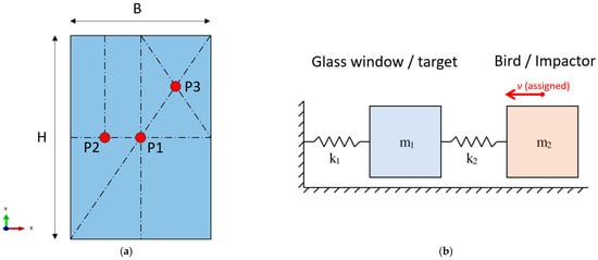 Schematic representation of (a) selected target points on glass (front view) and (b) 2DOF schematization for undamped glass window under bird-strike.