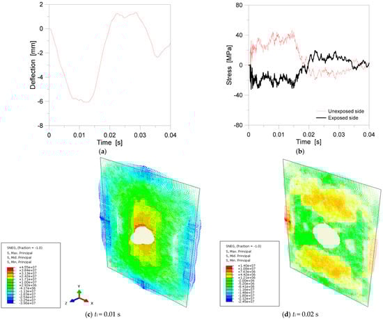 Example of bird-strike analysis: (a) deflection at the center of glass, (b) maximum stresses at the center of glass, and (c,d) stress distribution (legend values in Pa) at selected time instants (ABAQUS/Explicit). Example for t = 6 mm thick glass, B#1 impactor at the center (v = 10 m/s of impact speed).