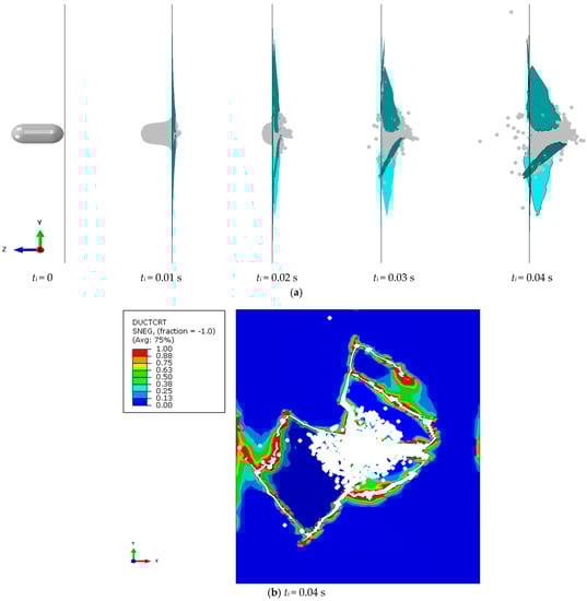 Example of failure mechanism for glass panel under B#1 impactor (v = 10 m/s): (a) sequential side view and (b) front view with damage distribution (ABAQUS/Explicit).