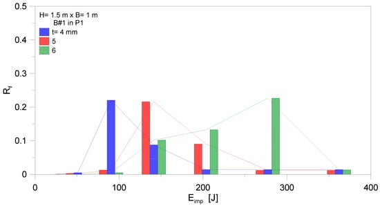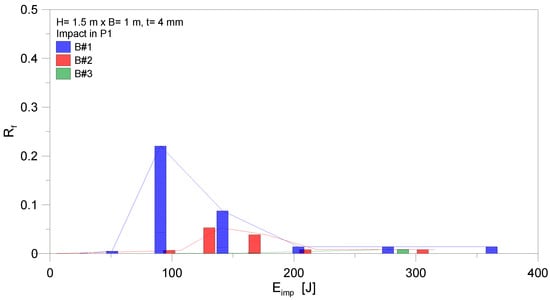 In this context, a first set of non-linear dynamic simulations and damage severity estimated was parametrically carried out. Figure 20c presents the expected Rf damage amount for the same steel–glass system under B#1 impactor (target point at the center of panel). Input values of histogram chart were numerically derived based on Equation (6). The maximum impact energy for the parametric configurations in Figure 20c was set in a top value of 400 J, due to realistic mass and velocity input values for the examined scenarios. In this sense, higher impact energies for the same B#1 mass would necessarily require an impact speed which is out of ranges for conventional values as in Table 1. It can be seen that the calculated Rf parameter progressively increases from zero when the impact energy is in the range of ≈141 J (with Rf = 0.09, no cracks).