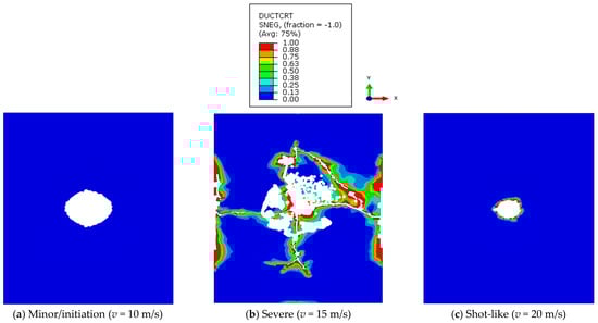 A qualitative comparison of different breakage patterns can be seen in Figure 15 (for the t = 6 mm thick panel), where the bird impactor (SPH model) is detected by white elements. In Figure 15a, rather null damage can be measured in glass (i.e., no visible cracks), with a rather linear elastic response and minor damage/initiation only (i.e., mechanical degradation of material properties in post-elastic stage). In Figure 15b, major cracks propagate from the center and also affect the region of restraints (severe damage). In Figure 15c, finally, an example of “shot-like” fracture pattern is proposed.