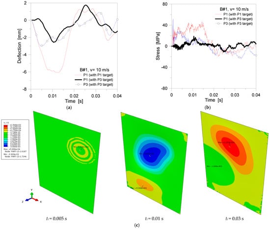 Figure 17a, for example, shows the out-of-plane displacement in time, with evidence of typical behaviors. For the examined impact conditions, it can be noted that maximum deflection effects can be rationally expected for impact in the center of window (P1 control point), under a fixed impact energy. This happens when the target point coincides with P1 but maximum deflection peaks are relatively high also for the panel subjected to other impacts. Such a finding can be noted by comparing the displacement-time histories of P1 and P3 control points when the target point coincides with P3. It can be noted that the maximum bending deformation is measured in P3 (target) at around 3 mm, and that is less than the 50% part of the P1 target scenario. This is slightly higher than P1 displacement due to the P3 target (2.6 mm), and again less than the 50% part of the P1 displacement under the P1 target.