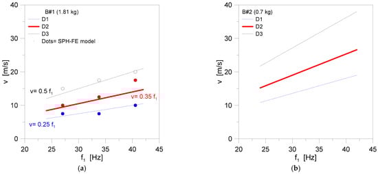 where v is the impact speed (up to ≈20 m/s and ≈40 m/s for B#1 and B#2).