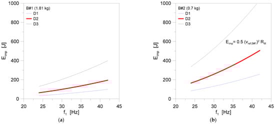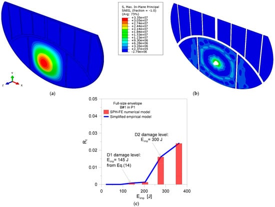 It is worth noting from Figure 20c that the impact condition for minimum damage initiation was numerically predicted under an imposed impact energy, and this—even under simplifications of the empirical procedure—is in close agreement with Equation (14). A good correlation can be noted both for D1 and for D2 damage levels. Minor D1 damage is numerically expected in Figure 20c for an impact energy of ≈141.5 J, which has a scatter of 2.4% compared to Equation (14).