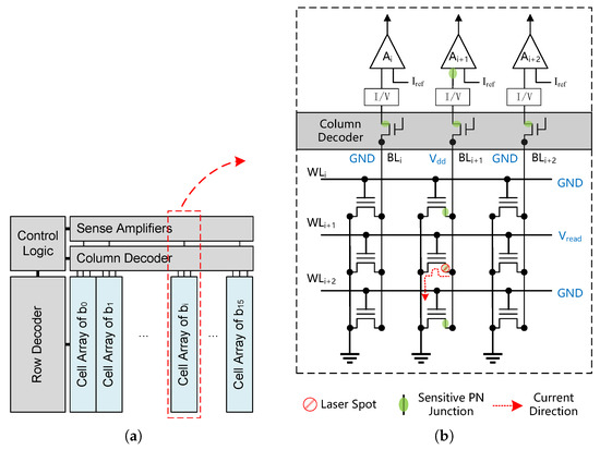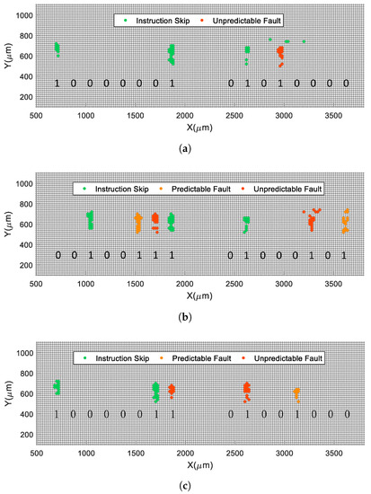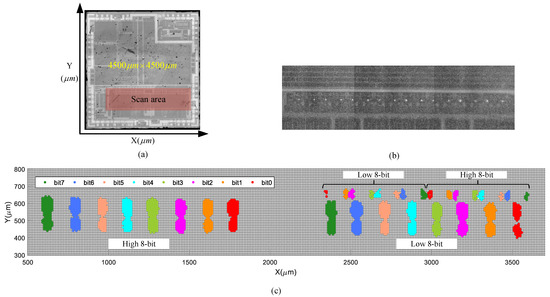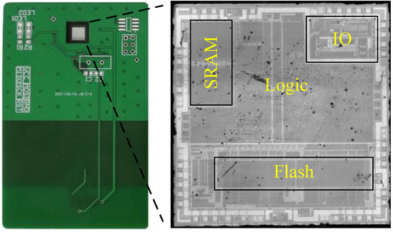 - There are 16 highlighted areas in the upper right corner of the Flash, which also correspond to 16-bit sensitive areas, respectively. The attack effect against these areas is consistent with the above. We further track the photon radiation of the Flash region and find 16 conspicuous photon leakage points in the upper right corner, as shown in Figure 6b, which indicates that there are frequent transistor switching operations in this area. These areas may indicate the control register location in the Flash read–write control circuit.