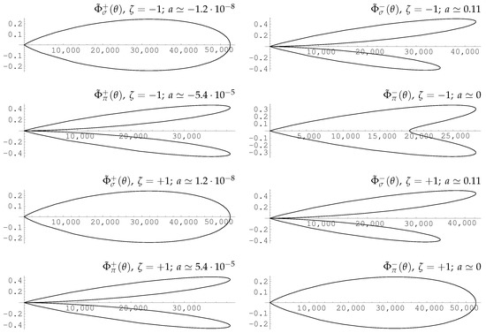 In our case, contrary to [20,21], the operator (17), commuting with , should be used, describing “transversal-longitudinal” polarization of the particle. Now, System (34) can be solved, and considering the case , we arrive at: