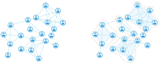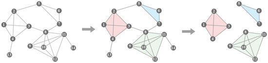 To extract the high-order subgraphs, we first list all the maximal cliques and rank them by size using the Bron–Kerbosch algorithm [40,41,42]. Then we start with the largest maximal clique, and assign related nodes to a group, as shown in Figure 2. We continuously partition the unassigned node into the largest group to which it belongs. Once a node has been assigned to a group, it is removed from the remaining smaller groups; nodes are only assigned to multiple groups in the case of equally sized maximal cliques. Ultimately, only nodes within the same group are connected by edges. While maximal clique refers to a group of nodes that are completely connected within a network, this definition is often overly restrictive. However, as networks are built from the observation of empirical data, spurious linkages may exist that muddle the pairwise relationships. The search for strictly clique-like groupings of nodes will not be easily confused by the spurious links (e.g., caused by data processing errors) in the dataset, as shown in Figure 3.