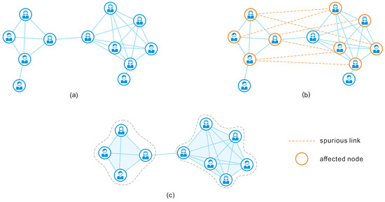 Strictly clique-like groupings of nodes will not be easily confused by the spurious links in the dataset. (a) Original network; (b) Network with noise; (c) Strictly clique-like groupings for both (a,b).
