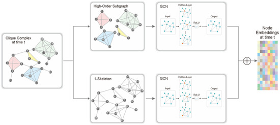 To model the different mechanisms of pairwise influence and group effects, we use a two-branch graph neural network, as shown in Figure 4, with one branch feeding the 1-skeleton graph and another branch feeding the high-order structures. That is, two different graph convolutional networks are used to model the 1-skeleton network and the high-order subgraphs separately for each time step.