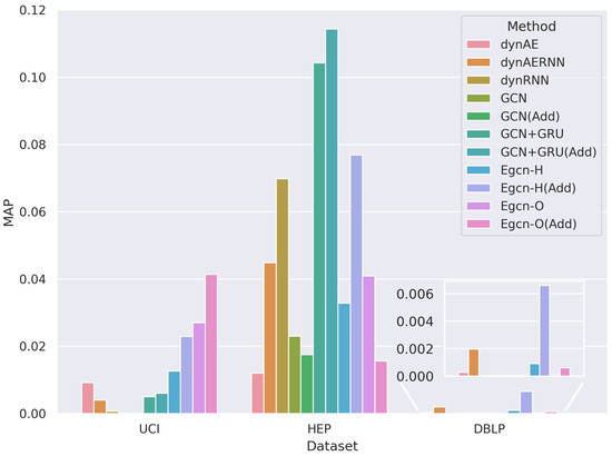 Table 2 and Figure 5 show the performance of all models for graph link prediction on the three datasets. Across each dataset, it is shown that the best results are all achieved by models enhanced with high-order information. When comparing the performance of the best models with the second best ones, the following can be found: on the UCI dataset, Egcn-O (Add) improves 53.33% over the original Egcn-O model; on the HEP dataset, GCN+GRU (Add) improves 9.63% over the original GCN+GRU model; and on the DBLP dataset, Egcn-H (Add) model improves 9.63% over dynARERNN by 235.93%. When comparing the high-order enhanced models with the backbones, we can see that 9 of the 12 high-order topology-enhanced models exceed the corresponding backbone models, with a maximum improvement of 633% for MAP and an average improvement of 173%. Among them, on the UCI dataset, the high-order enhanced models of GCN and GCN+GRU improve 115.79% and 20.00% over the original backbone models; on the HEP dataset, GCN+GRU (Add) improves 9.63% over the original GCN+GRU; and on the DBLP dataset, the high-order version of GCN improve 9.84%. In addition, since most of the best results are found in the augmented model with the Egcn model as the backbone, we specifically compare the original Egcn model with the augmented version, as shown in Figure 6.