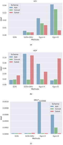 Figure 7 shows the performance of the enhanced models with different schemes. It can be found that different combination schemes perform differently across datasets. On the UCI dataset and the DBLP dataset, the weighted addition schemes have the best performance. However, in the HEP dataset, the gated scheme paired with the Egcn-O backbone yields a considerable improvement (which the addition scheme is incapable of). Considering the fact that the gated update strategy requires more parameters and the weighted addition scheme can have a competitive performance in most circumstances, we recommend the addition scheme in practice.