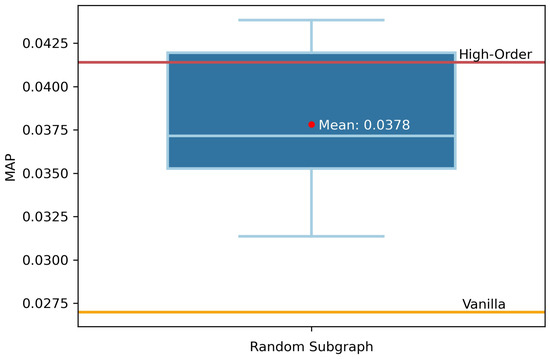 To verify that the improvement is attributed to the introduction of high-order information and not just a result of an increase in the network capacity caused by the addition of a branch, we conducted 10 experiments using random subgraphs. Specifically, we randomly sampled subgraphs with nodes and node degrees consistent with the high-order subgraphs and also used a two-branch model to conduct link prediction; the results are shown in Figure 8. There are two lines on the box plot, with the top line representing the performance of the high-order topology-enhanced model, and the bottom one representing the result of the original model. It can be found that the random subgraphs also give a substantial boost to the model, indicating that increasing the network capacity does bring benefits. Meanwhile, the results based on the higher-order subgraphs are better than the mean and the median of the random subgraph-enhanced model, demonstrating that modeling high-order correlations can further improve performance. Although the performance of the high-order topology-enhanced model is slightly lower than the best performance of the random subgraph enhanced models, this suggests that there may be better structures in the network that can enhance the model. However, the mechanism for finding high-order subgraphs is certain, while the trial-and-error cost of finding the optimal structure using a random approach can be uncertain and challenging.