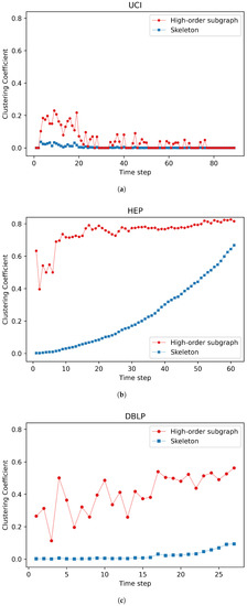 Clustering coefficients of (a) UCI, (b) HEP, and (c) DBLP datasets.