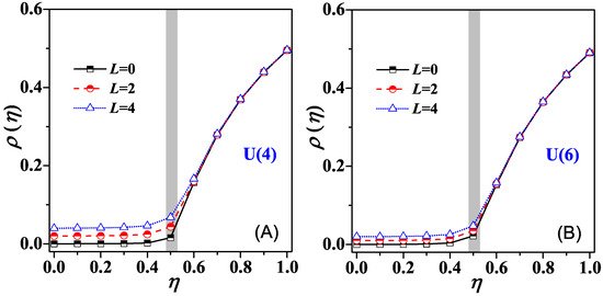 (A) The order parameter changes as a function of with the results solved from the U(4) model with for the lowest states of . (B) The same as in (A) but for those solved from the U(6) model.